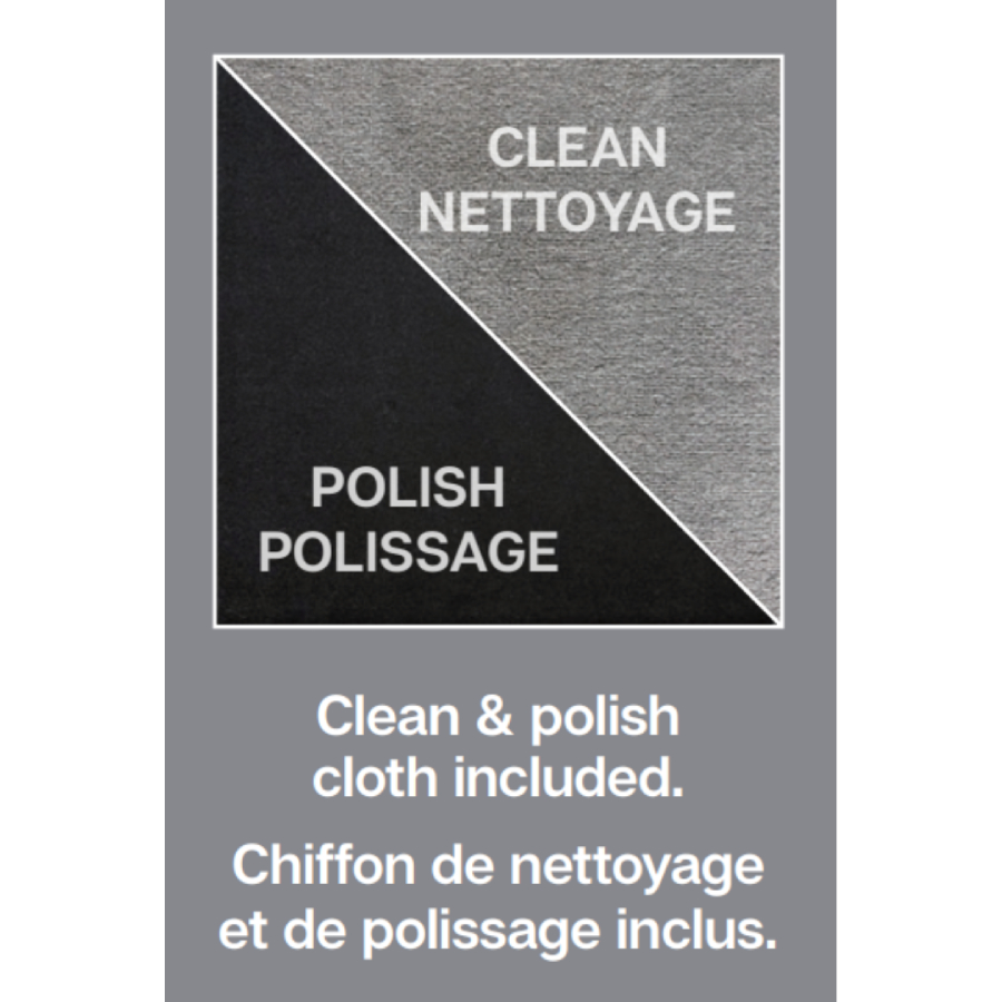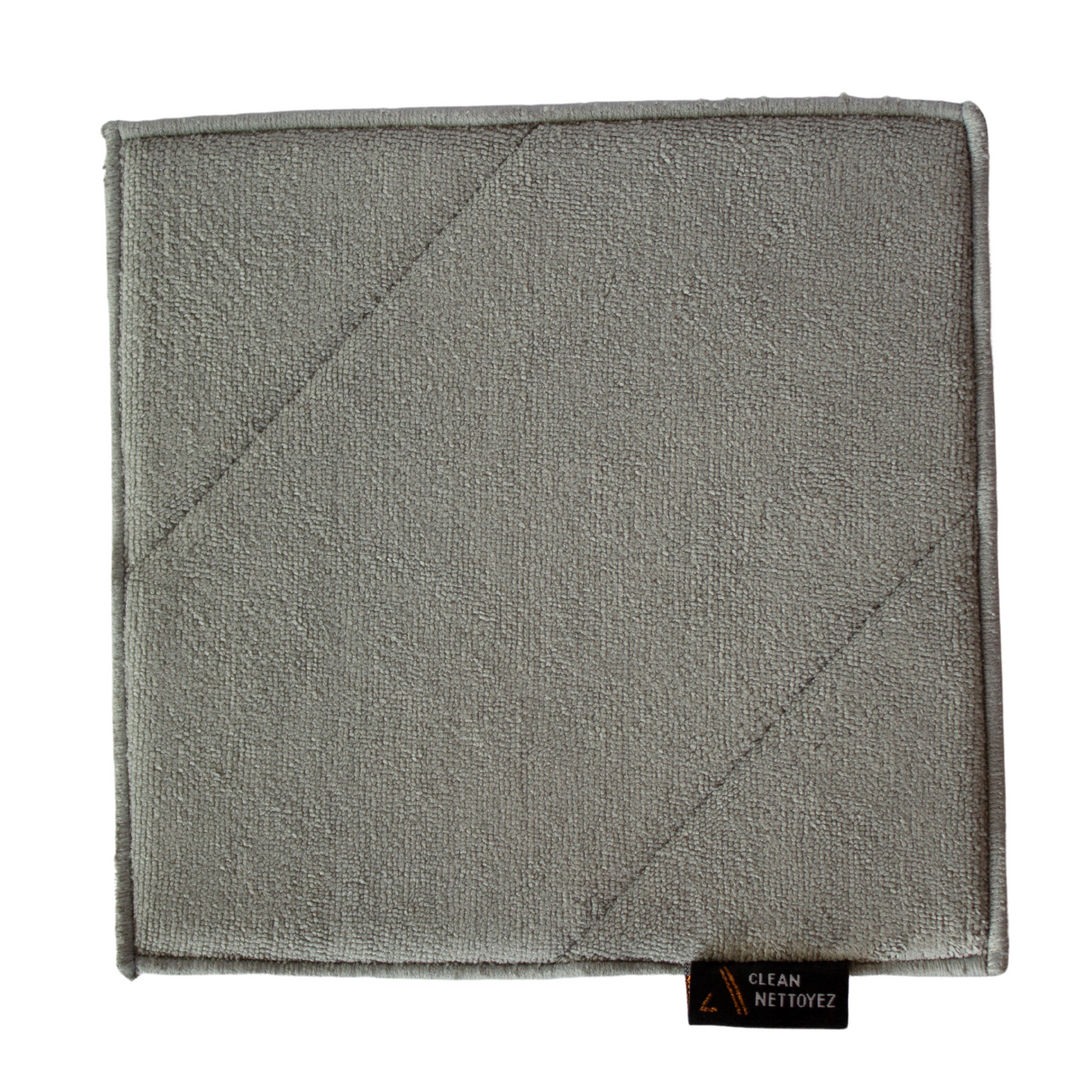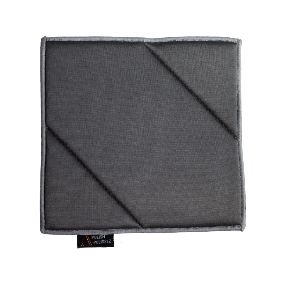 Clean & Polish Cloth \\ Our anti-bacterial microfiber dual-sided cloth cleans and polishes your displays gently and thoroughly. Scratch-free, streak-free and lint free. Reusable and machine washable. A fabric tag identifies which side is clean and which is polish. The cleaning side has a microfiber terry and the polish side has a special smooth satin microfiber. Our cloth has a foam core and precision placed stitching making it easier to grip. 6.7”x6.7”