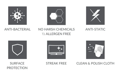 Streak Free \\ Our formula effortlessly cuts through grease, and dirt and removes fingerprints leaving no streaks, lint, or spots. Say hello to a spotless television, mobile device or home office accessories