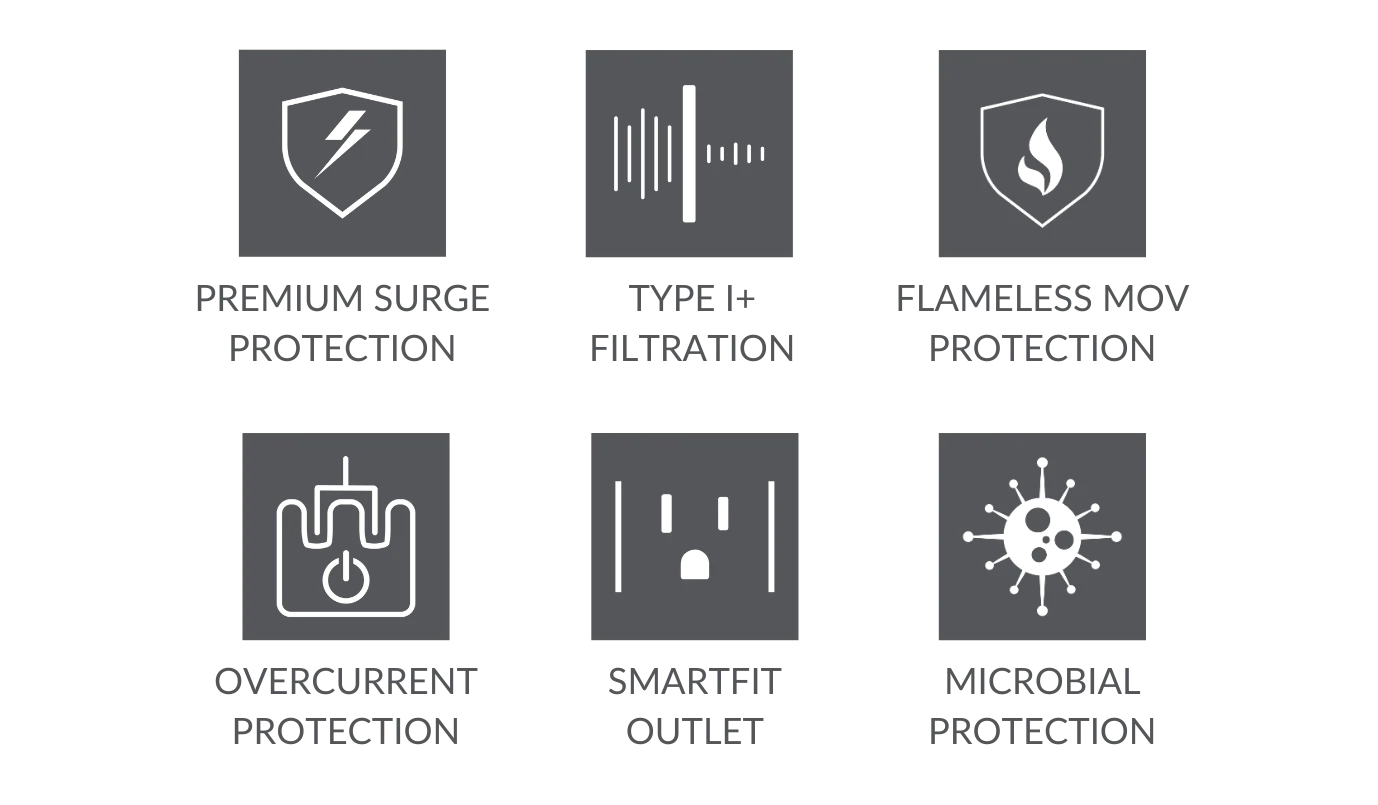 Fire & Power Spike Safety \\ Austere surge protection regulates the power coming from the outside powerline to ensure devices do not burn out from a high voltage spike that can be harmful to your equipment. Flameless MOV Protection gives you peace of mind that powerful surges will not result in a dangerous fire. OverCurrent Protection ensures that our thermal protected power circuit cannot exceed 18 amps, which could cause devices to short circuit or create dangerous temperatures that may lead to a fire.