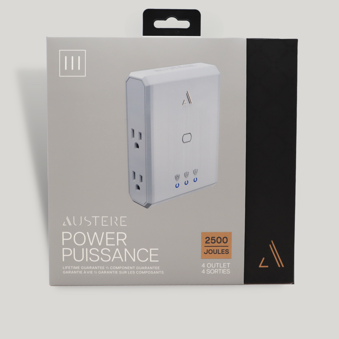 aDesign Philosophy \\ At Austere we not only believe in the details; we obsess over them. Austere III Series 4-Outlet Power delivers superior protection in a compact enclosure with a linear pattern luxe white finish and high-gloss white side trim. Our ultra-wide SmartFit outlets provide extra room to accommodate the bulkiest plugs. Austere Power sits flush with the wall and fits discreetly in the tightest of spaces whether on the counter or behind kitchen appliances. The wall-mountable design allows Austere Power to be attached to the outlet and comes with an optional security screw.