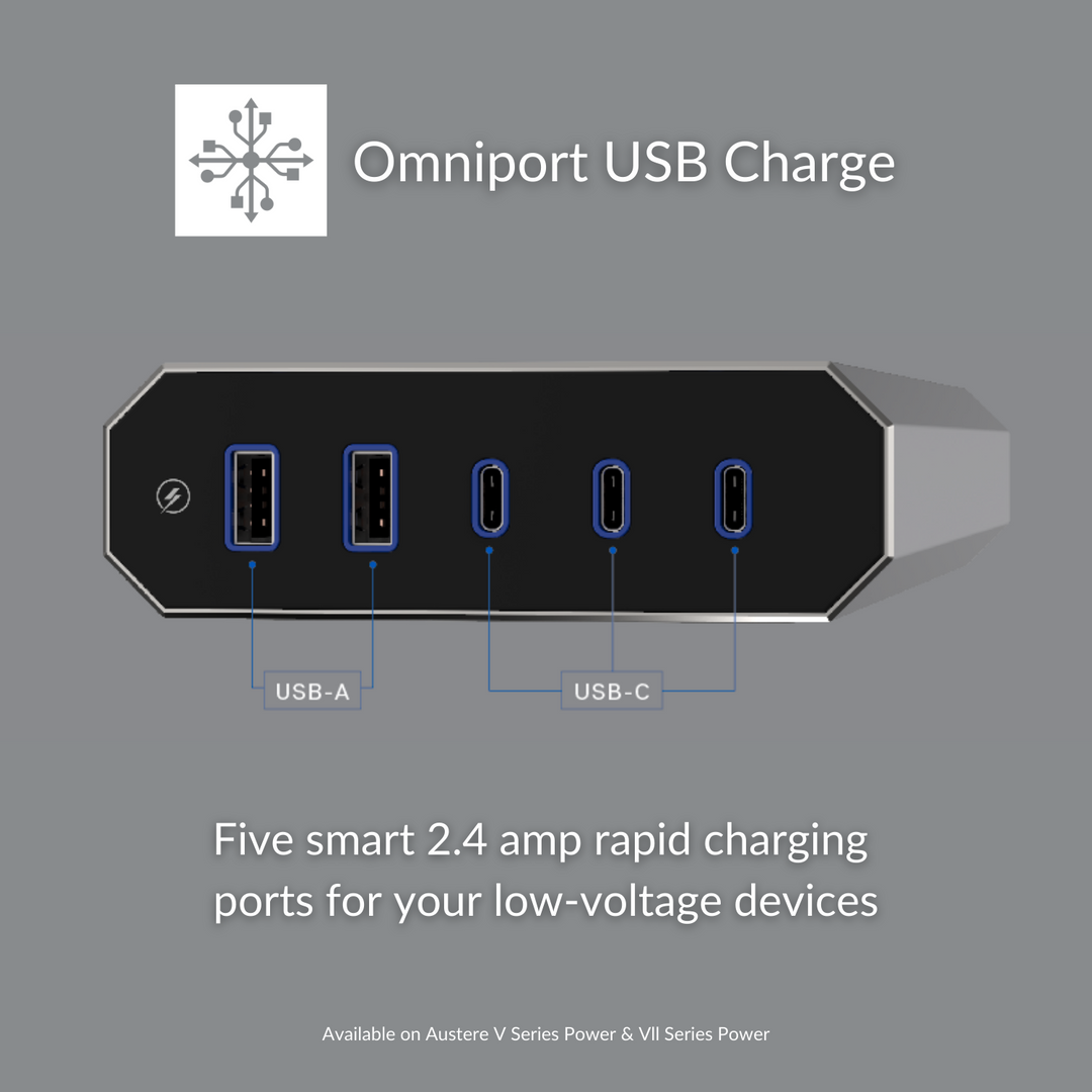 Rapid Charge \\ The OmniPort USB features five rapid charging ports (2 USB-A; 3 USB-C) to each deliver up to 2.4 Amps of charging power while protecting all of your low-voltage devices.