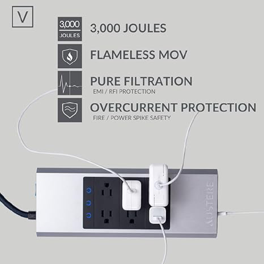 Austere employs flameless MOV circuits and thermal protected outlets, keeping you safe from a home electrical fire.