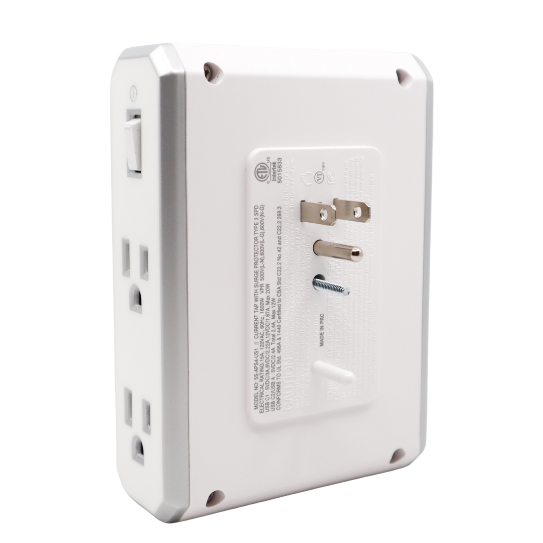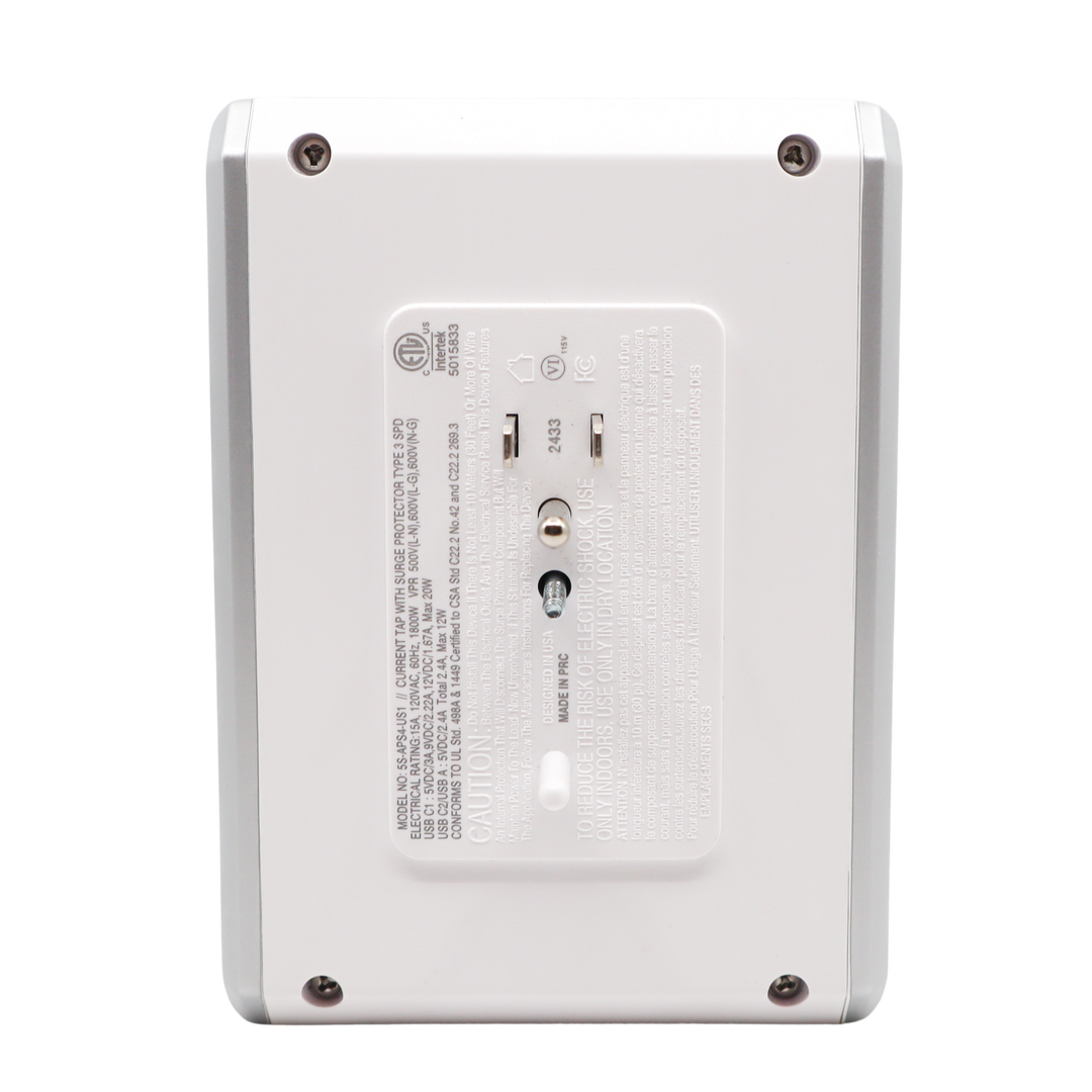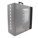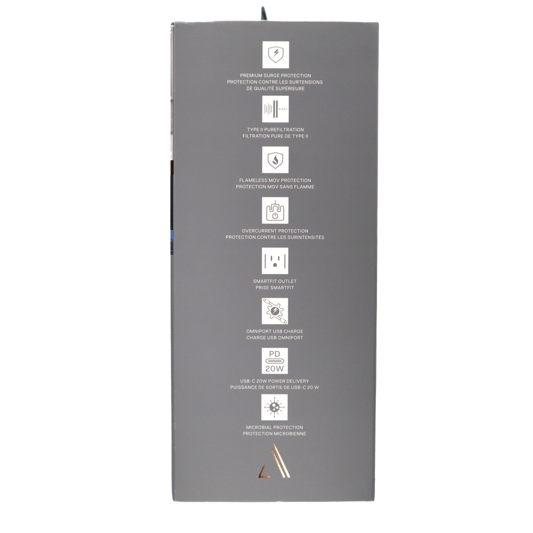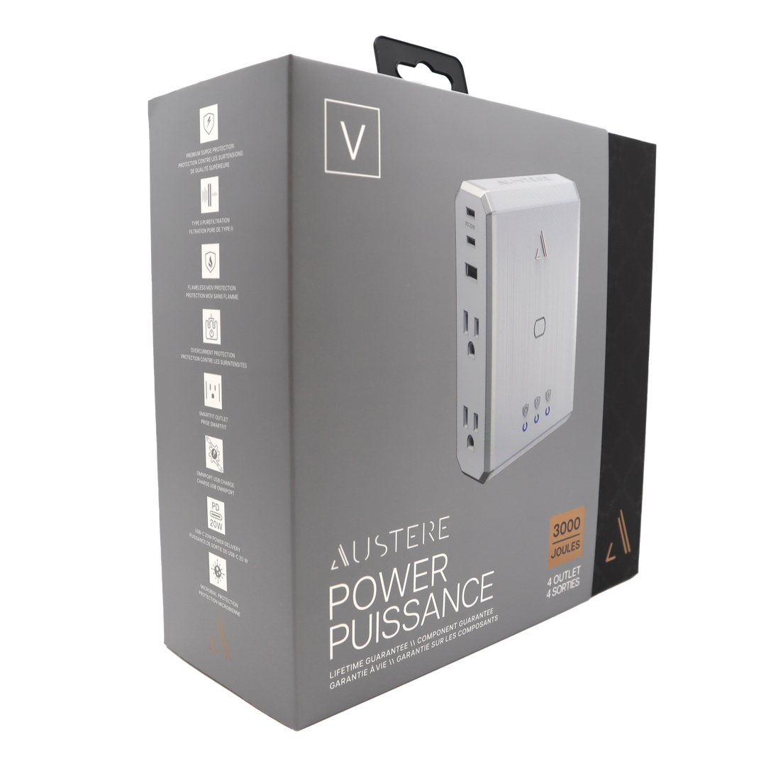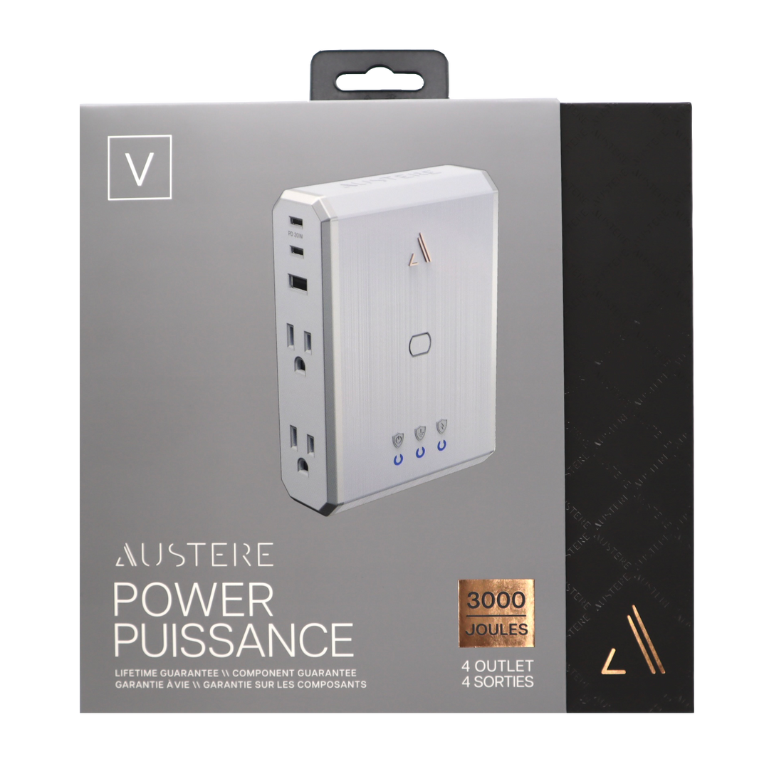 aDesign Philosophy \\ At Austere we not only believe in the details; we obsess over them. Austere V Series 4-Outlet Power delivers superior protection in a compact enclosure with a linear pattern luxe white finish and polished metalized side panels with silver trim. Our ultra-wide SmartFit outlets provide extra room to accommodate the bulkiest plugs. Austere Power sits flush with the wall and fits discreetly in the tightest of spaces, whether on the counter or behind kitchen appliances. The wall-mountable design allows Austere Power to be attached to the outlet and comes with an optional security screw.