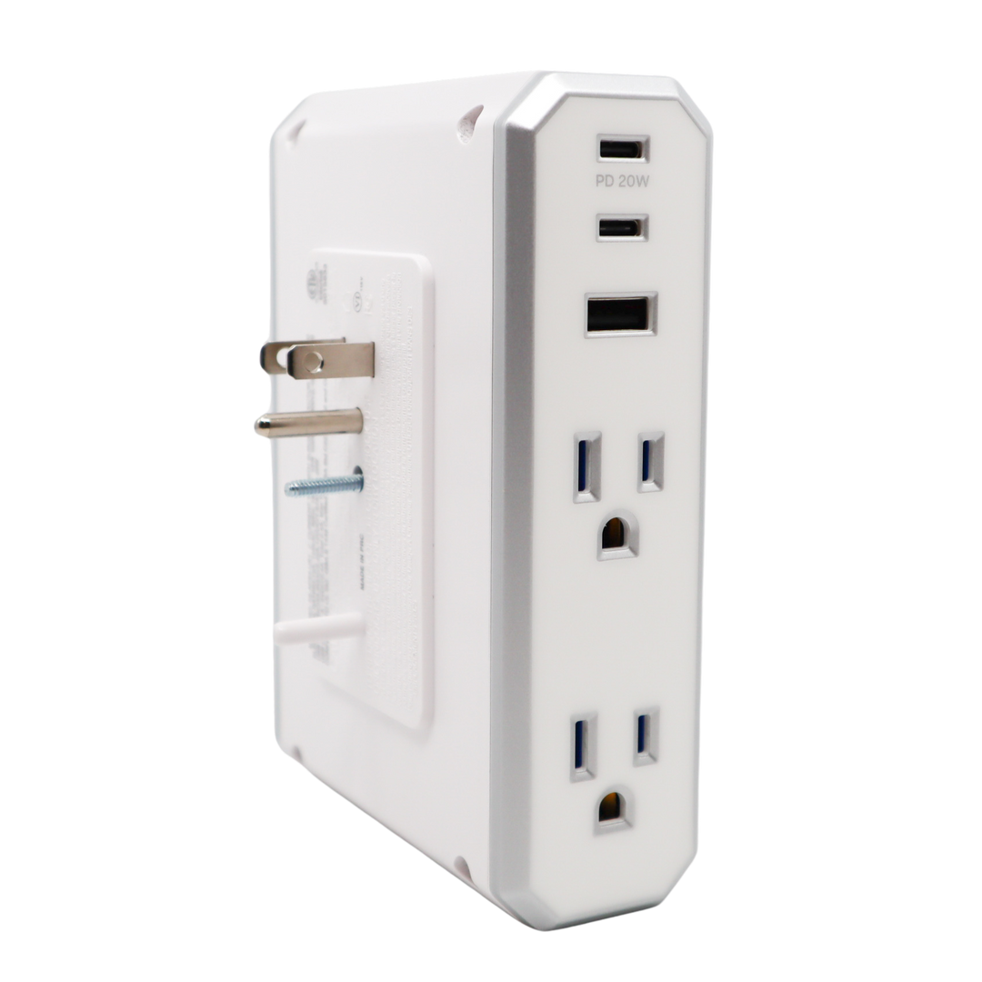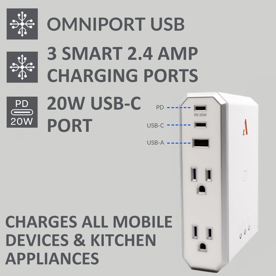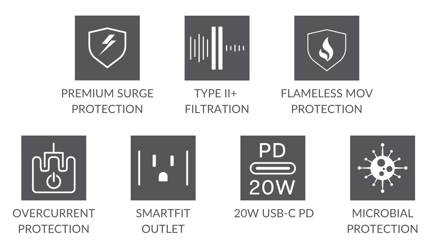 Microban® Antimicrobial Protection — Contaminant-Free Confidence \\ Engineered with Microban® antimicrobial technology, Austere’s surge protector wall charger delivers powerful, long-lasting protection against bacteria, mold, and mildew that can cause stains, odors, and product degradation. Its surface actively resists microbial growth 24/7, making it an ideal solution for high-traffic or moisture-prone environments like kitchens, bathrooms, and garages. Whether facing spills, splatters, or everyday grime, the sleek exterior remains visibly clean and hygienically protected, ensuring your power hub stays as pristine as your space.