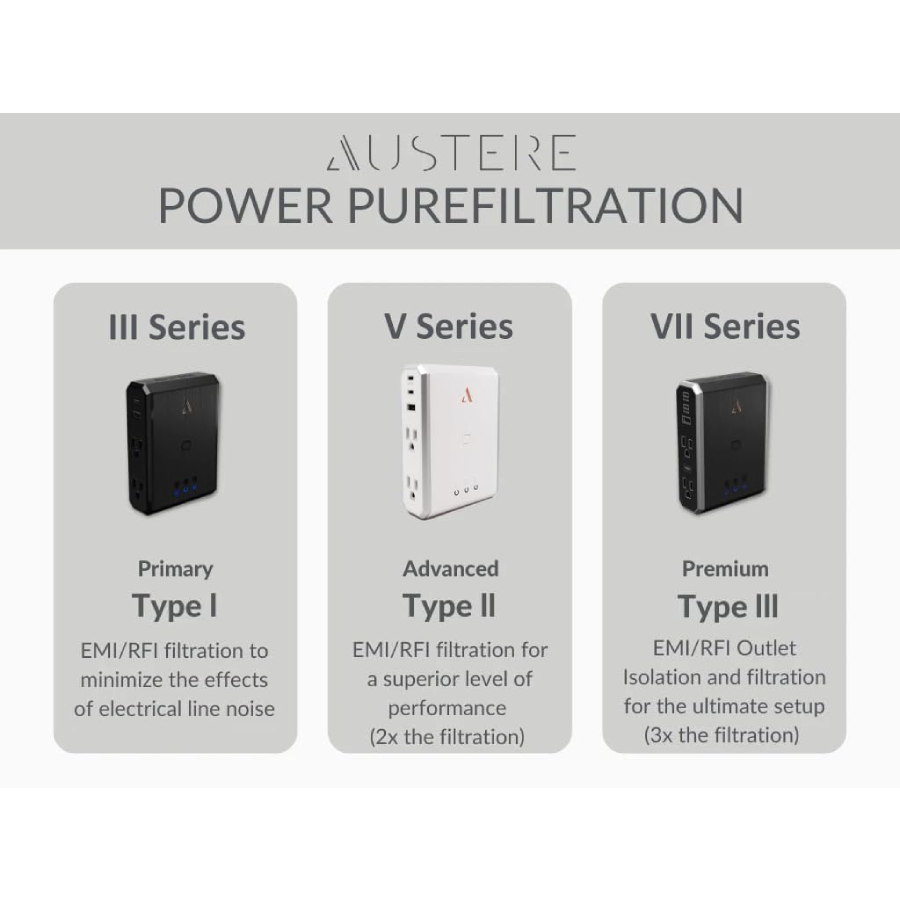 Advanced EMI/RFI PureFiltration \\ PureFiltration acts like a protective force field to prevent external EMI/RFI disturbances from degrading your sensitive electronics and kitchen experience. EMI – or Electromagnetic Interference – occurs when devices are near one another. Frequent exposure to EMI disturbances will harm your premium kitchen appliances and impede performance. Austere V Series Power has PureFiltration Type II+: Advanced EMI/RFI filtration for a superior level of performance.