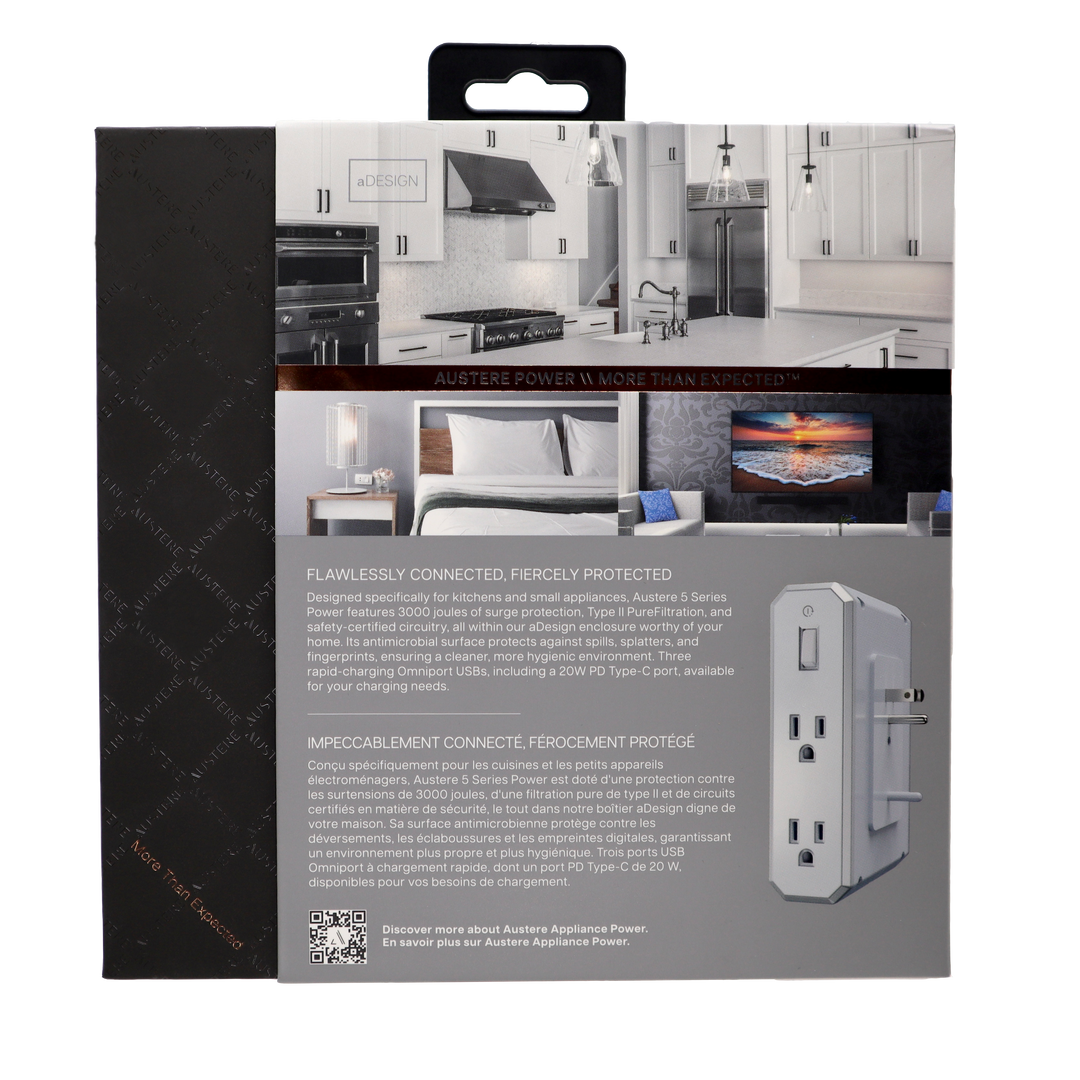 Austere V Series premium surge protection is designed not only for kitchens and small appliances, but also ideal for protecting devices in home offices and bedrooms. Designed in the USA, Austere products naturally coexist as part of an entire home ecosystem. Always.