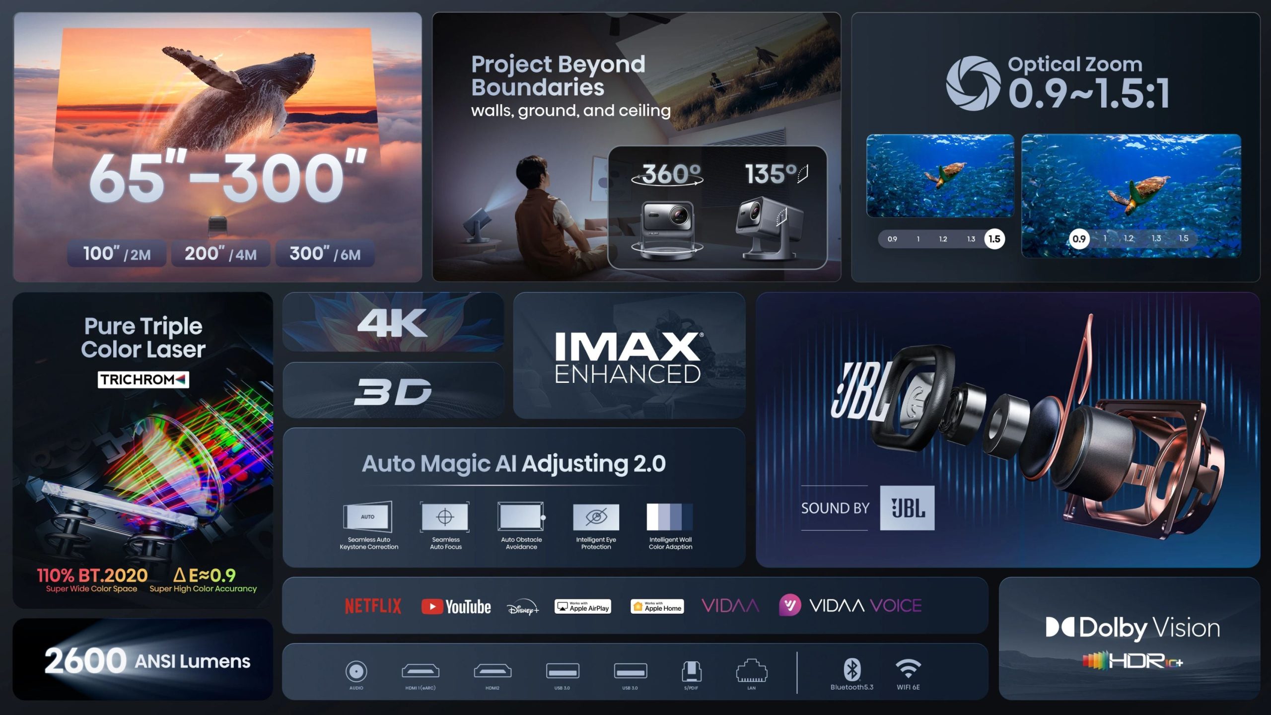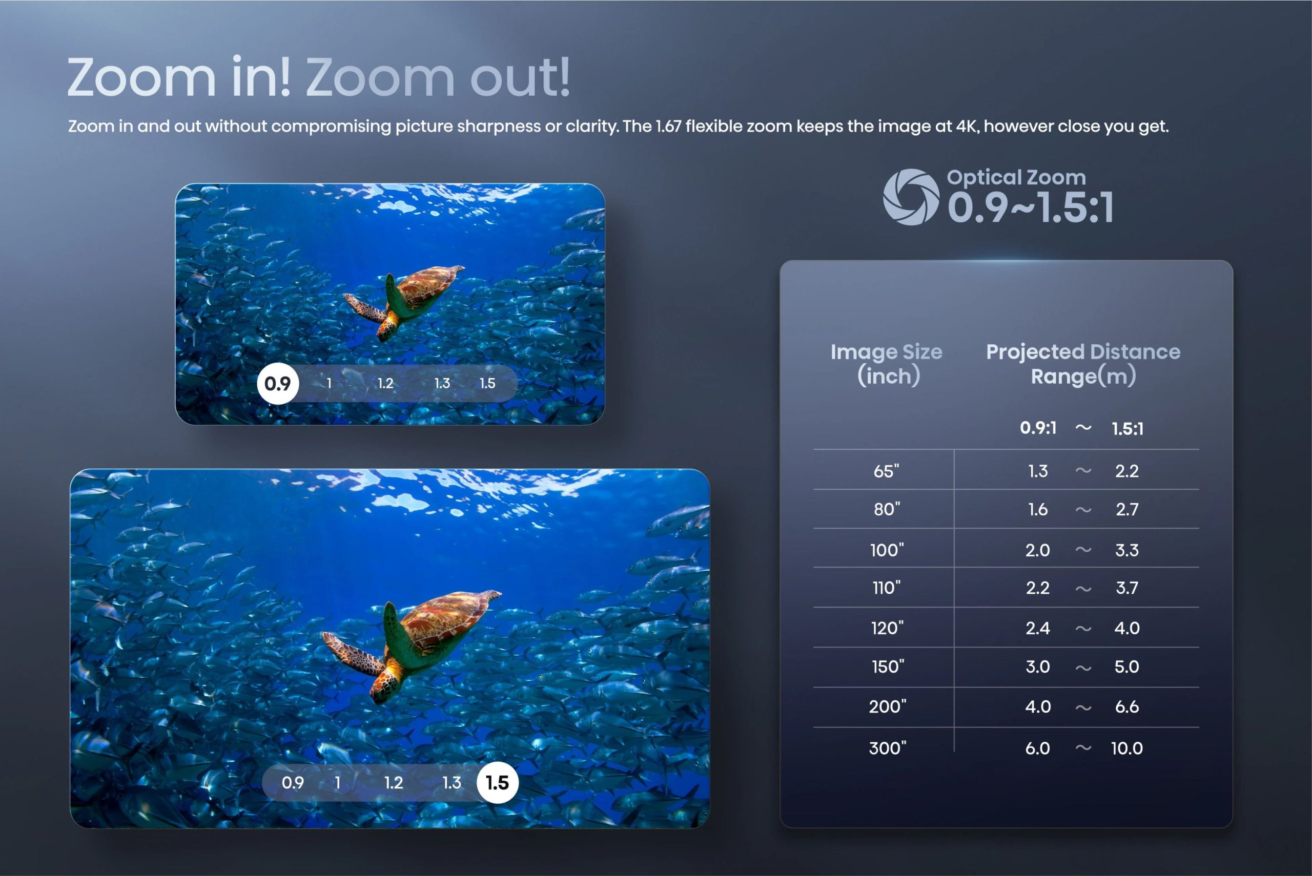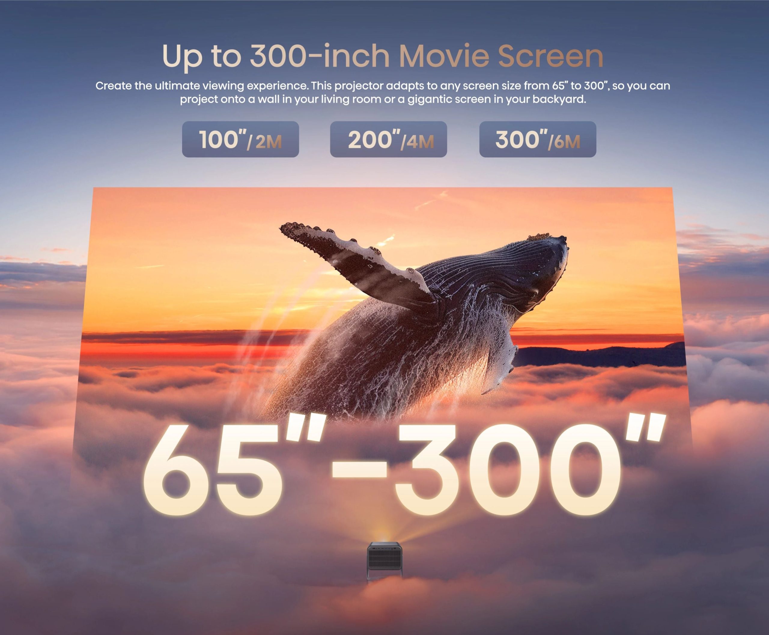 - Projection Size: 65″ to 300″ adjustable display