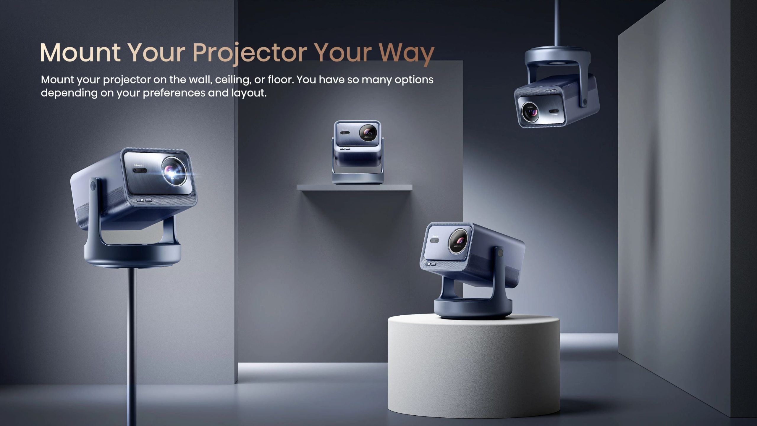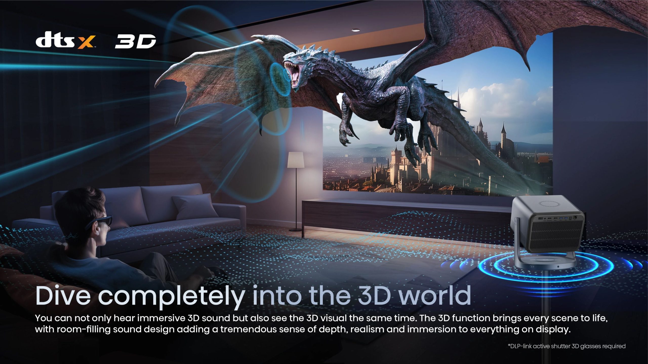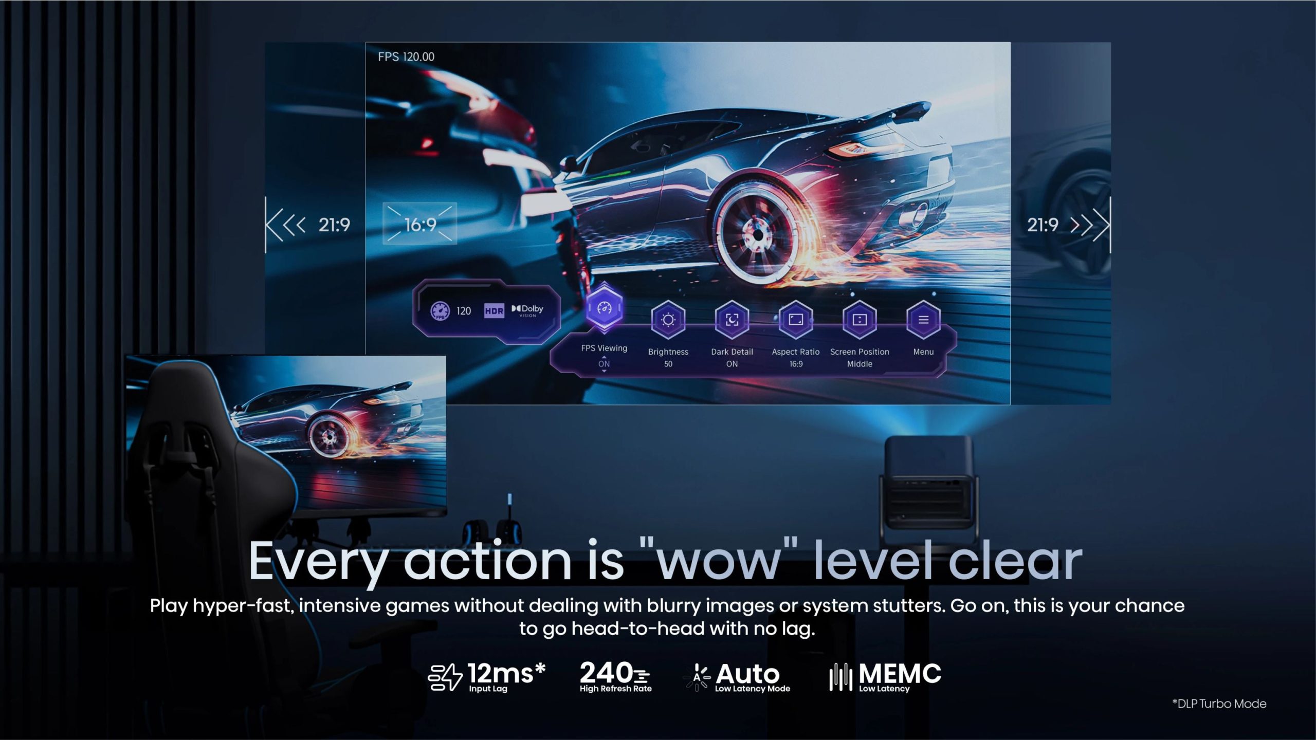 - Projection Size: 65″ to 300″ adjustable display