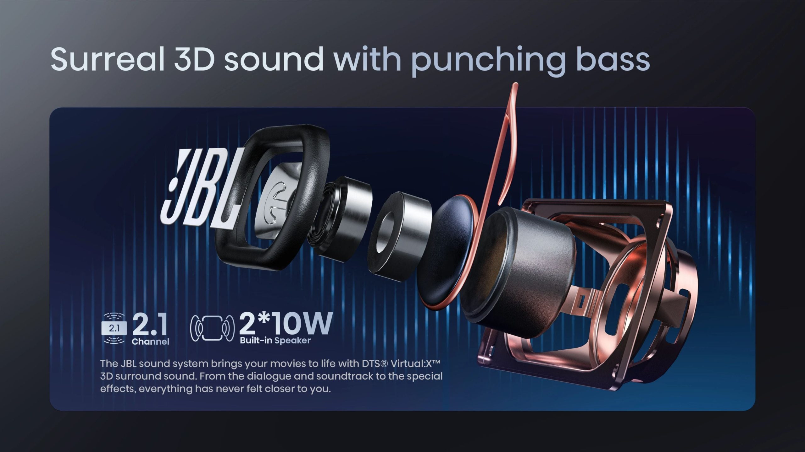 - Audio: Built-in JBL 20W speakers with Virtual:X™ 3D surround