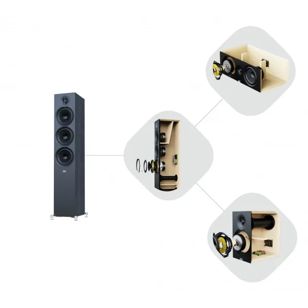 All Debut 3.0 models utilize strategically placed internal bracing reinforcing the cabinet structure, effectively minimizing resonances and unwanted vibrations, thereby improving the clarity and accuracy of sound reproduction. This results in a more accurate reproduction of audio, as it ensures that sound is primarily emitted from the speaker drivers.