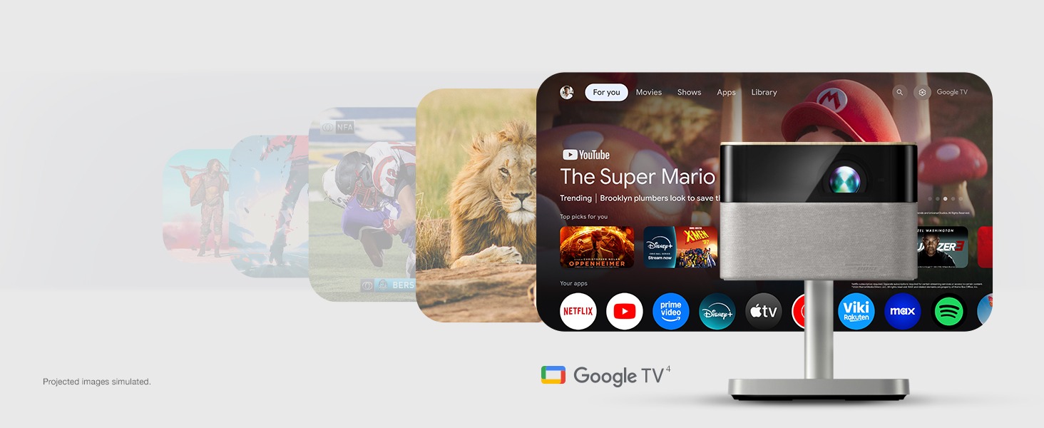 Finding something to watch has never been easier. Just power on your Lifestudio portable lifestyle projector and the built-in Google TV™4 puts over 10,000 streaming apps at your fingertips5, including Netflix®, Disney+®, and Hulu®. Plus, with Google Assistant™ you can use the included voice remote to search across all apps, including live TV and even YouTube™ to find exactly what you’re looking for.