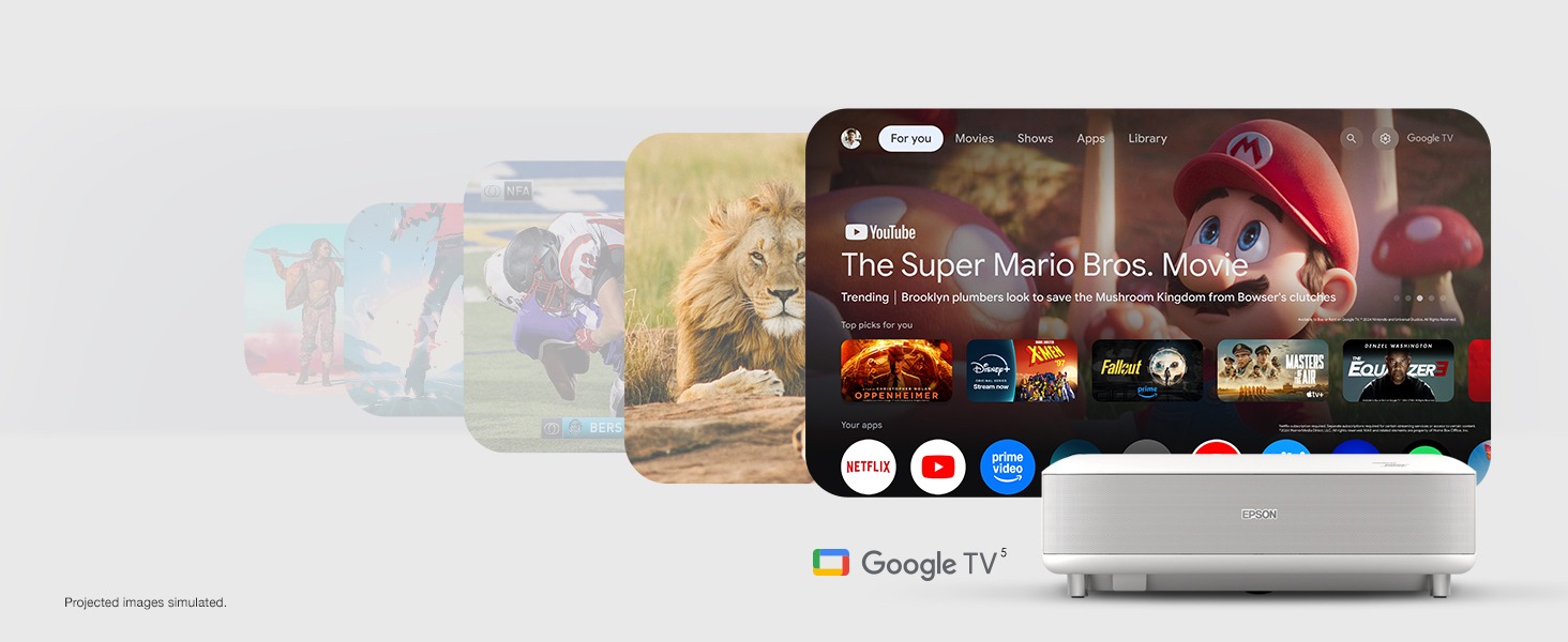 And finding something to watch has never been easier. Just power on your Lifestudio Grand projector and the built-in Google TV™5 puts over 10,000 streaming apps at your fingertips6, including Netflix®, Disney+®, and Hulu®. With Google Assistant™ you can use the included voice remote to search across all apps, including live TV and even YouTube™ to find exactly what you’re looking for.