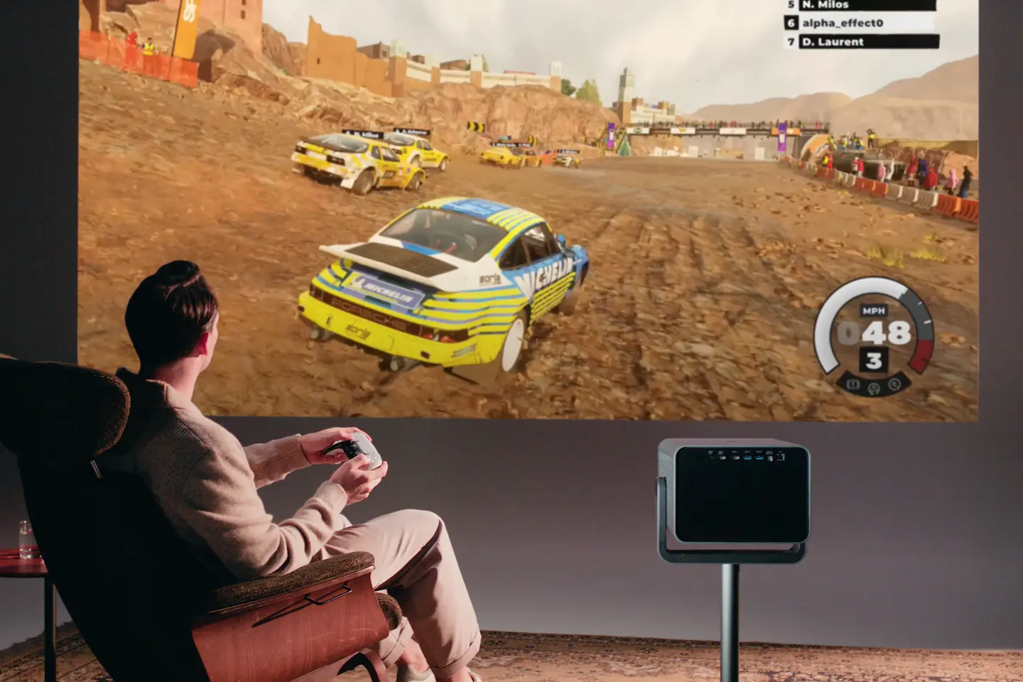 The Game Mode available with the Leica Cine Play 1 makes it possible for gaming fans to playfully create an exciting, adrenaline-pumping atmosphere at any location. With a latency of less than 12 milliseconds and a refresh rate of up to 120 Hz, the Cine Play 1 is ideal for games that require lightning-fast reactions.