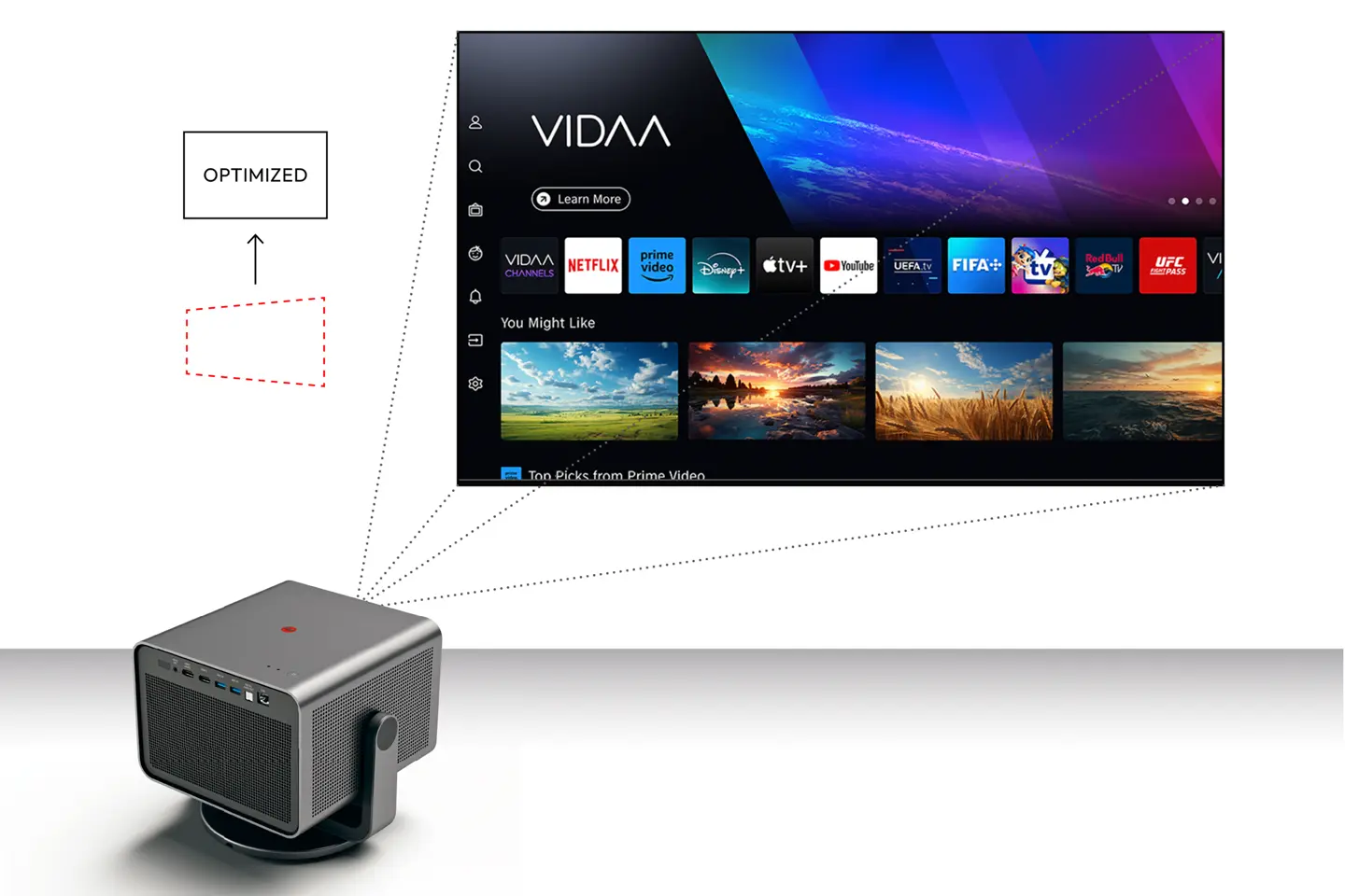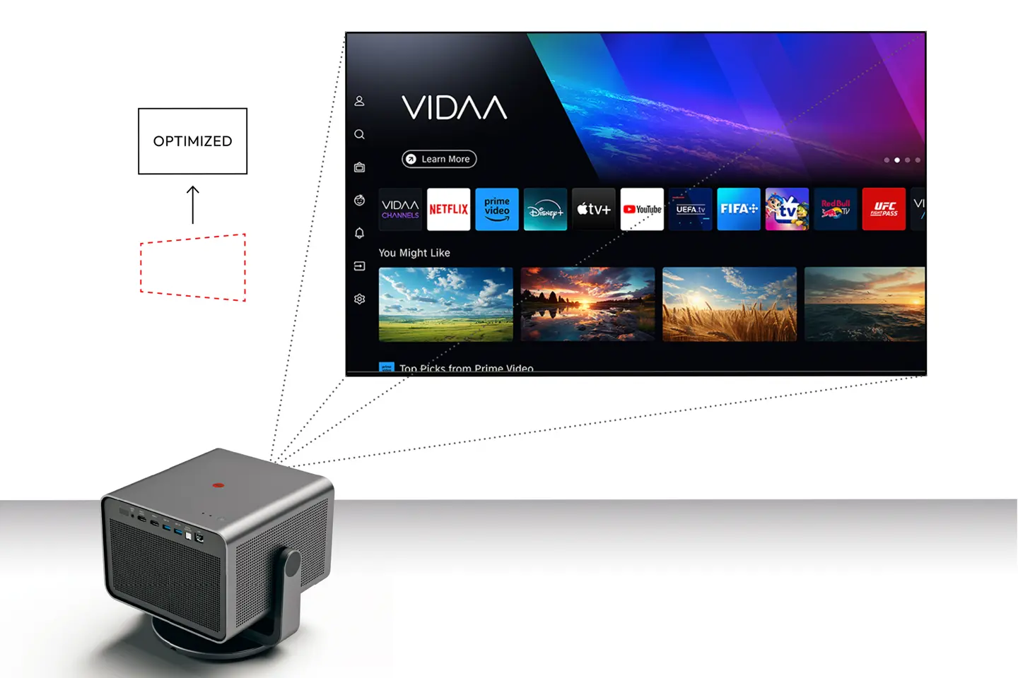 With its many connectivity options and intuitive VIDAA operating system, the projector can easily be connected to your smartphone or notebook. This means you can quickly access your favourite streaming apps.