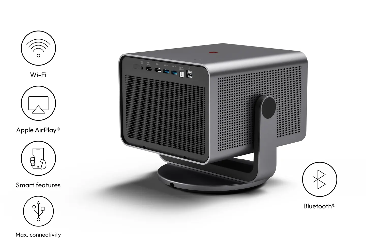 The Leica Cine Play 1 supports numerous wireless connections, such as Wi-Fi, Bluetooth, Apple AirPlay, Apple HomeKit, Screen Mirroring, etc., and offers various interface options (including HDMI, USB, LAN, audio out). As it can be easily connected to smartphones, laptops and soundbars, its possible applications are limitless.