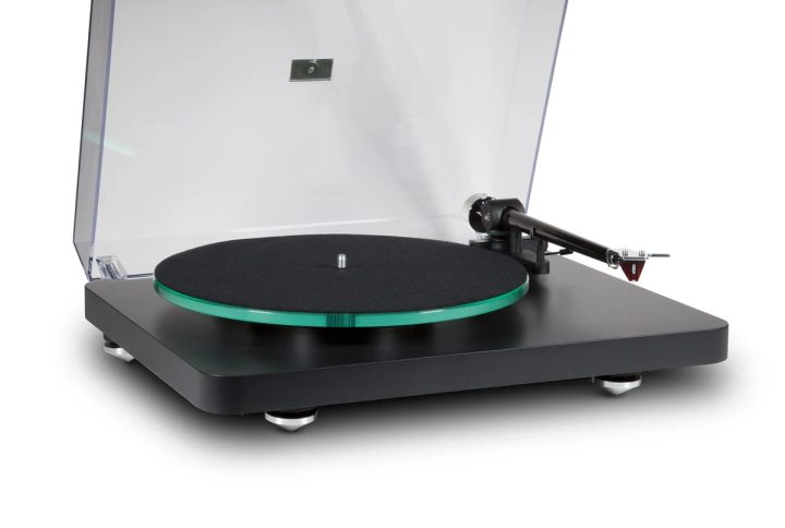 The MDF plinth, glass platter, and low-resonance design reduce vibration during playback.