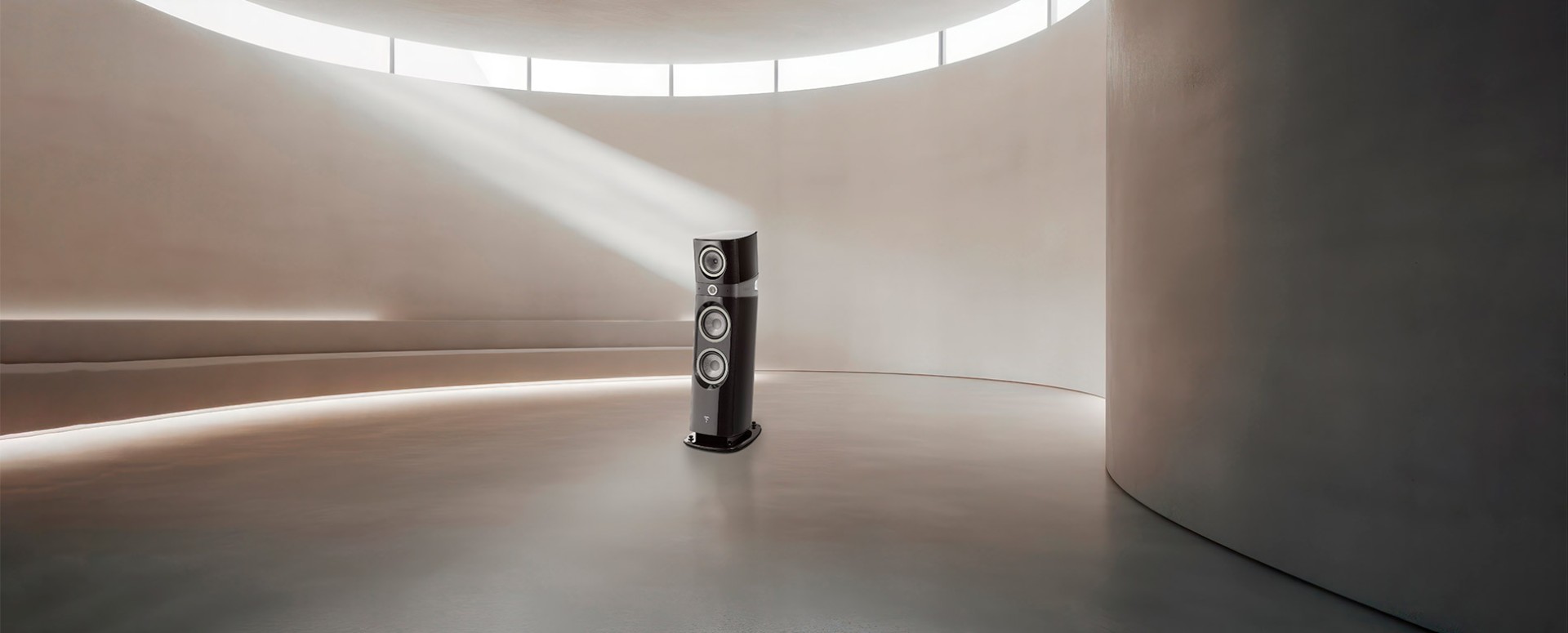 The architecture of the loudspeaker is articulated around the intermediate piece. Injected with polyurethane, this element allows the top and bottom cabinets to be tilted for “Focus Time”, ensuring perfect acoustic convergence of the channels at the listening point.