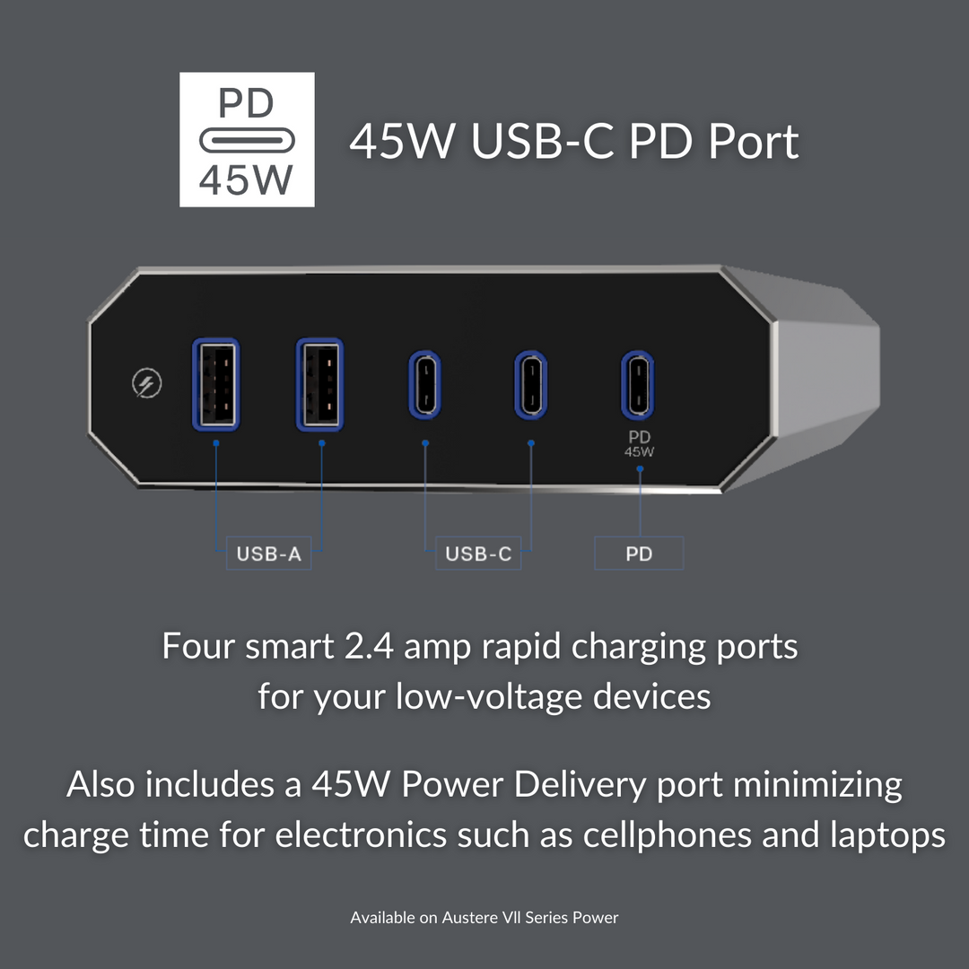 Rapid Charge \\ The OmniPort USB features five rapid charging ports (2 USB-A; 3 USB-C) to each deliver up to 2.4 Amps of charging power while protecting all of your low-voltage devices with an additional 45W USB-C PD port. These smart ports are designed to minimize charging time for your personal electronics such as cellphones and any handheld device that charges via USB