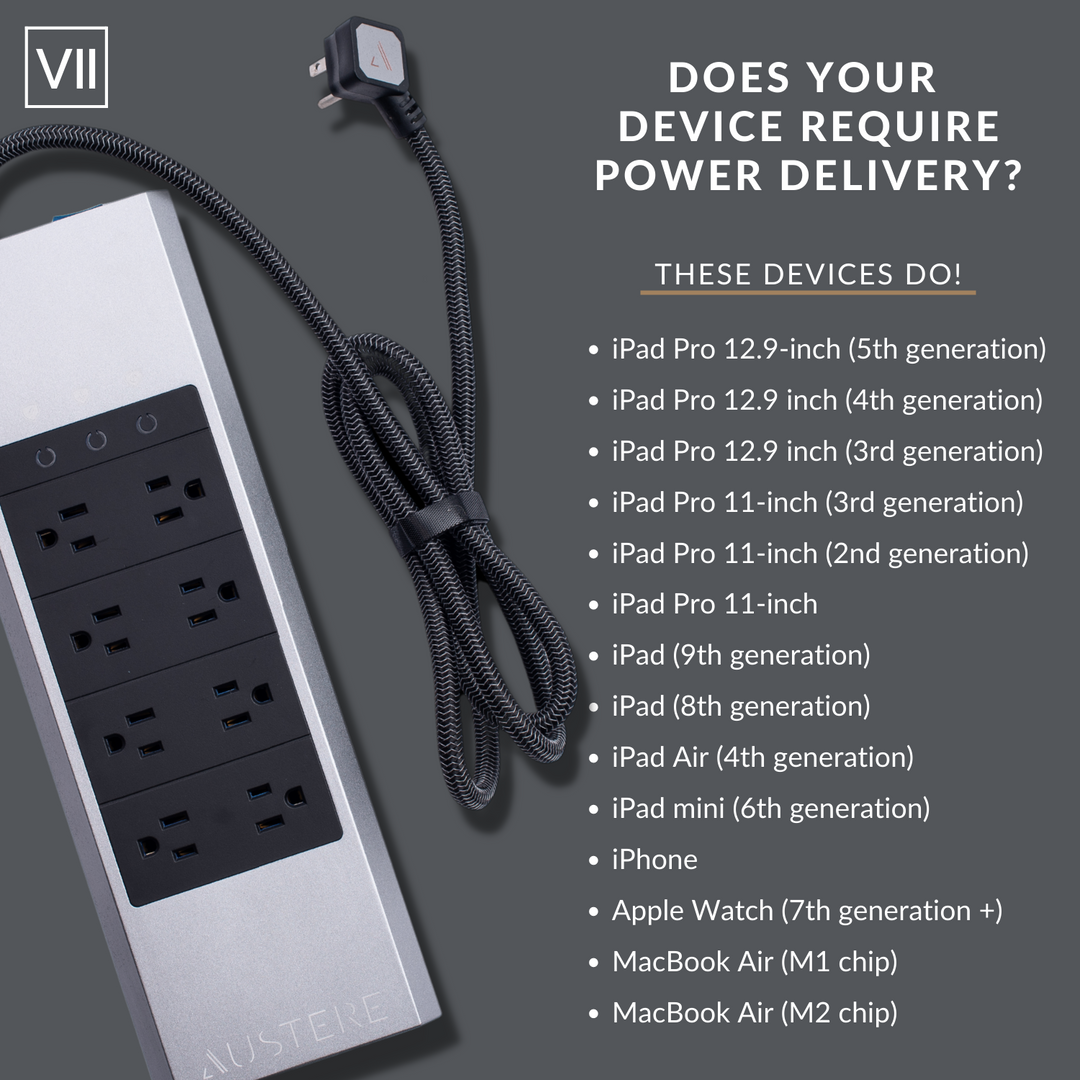 For the best charging experience and compatibility with both Apple and Samsung devices, we recommend first checking the compatibility of your device with the manufacturer. Our VII Series Power does support PD charging up to 45 watts through one USB-C port.