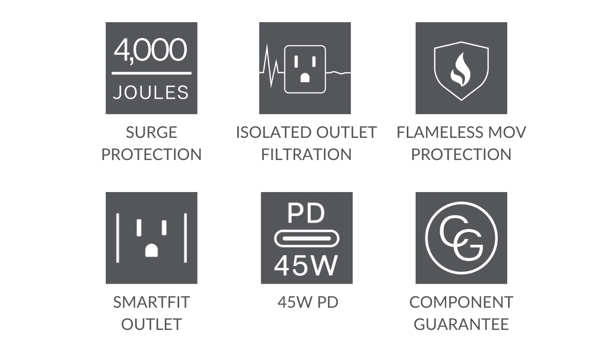 Austere is moving beyond the primary function of providing power, to a place where performance, safety, and design come together to define what you should expect in power. Austere Power innovation begins with our Isolated Outlet PureFiltration. This advanced EMI/RFI filtration will insulate the power signal from external disturbances to deliver video and audio clarity to your HDTV and sound system. In addition, the Omniport USB provides rapid charge and protection for low-voltage devices. And because your laptop is part of your entertainment system, Austere Power has a 45W USB-C PD port, that, unlike other power options, can uniquely charge it through a single cable. Austere also employs flameless MOV circuits and thermal protected outlets, keeping you safe from a home electrical fire. And if anything were to happen, our Component Guarantee promises to protect your equipment from damage, regardless of its value, whenever your devices are plugged into an Austere Power product.