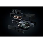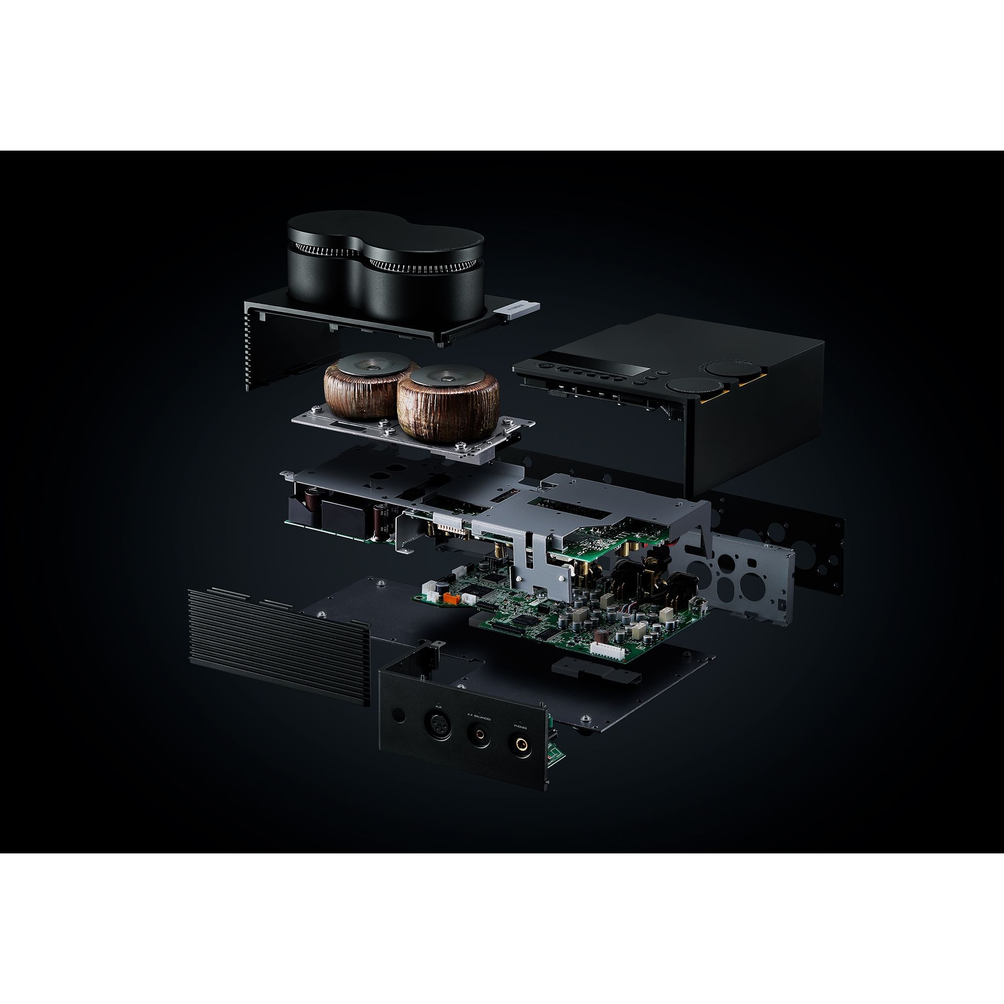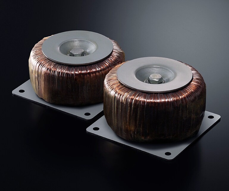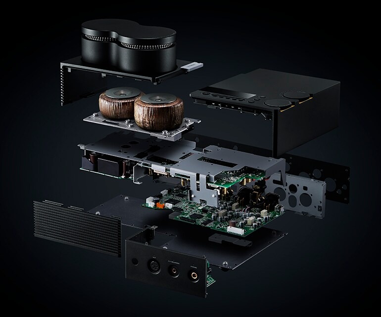 Following traditional audio principles and maintaining a low center of gravity, the two toroidal transformers are mounted on the main frame and represented in the unique external design, invoking an impression of fine modern architecture. Furthermore, thanks to a vertical three-dimensional structure, the transformer is located immediately above the power supply board, minimizing the power supply path, contributing to a design that delivers both high sound quality and a very cool cosmetic.