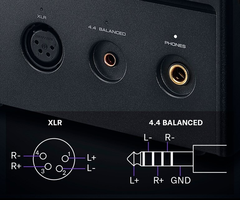 The front panel of the HA-L7A features two balanced headphone jacks that allow you to fully enjoy the detailed, high-quality of balanced circuitry. You’ll also find one unbalanced headphone jack that reduces contact loss thanks to gold-plated processing. Famed NEUTRIK jacks are used for the XLR balanced headphone jacks, and Pentaconn terminals are utilized for the 4.4mm 5-pole terminals, letting you connect your preferred headphones and unleash their full potential.