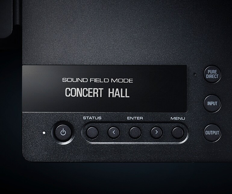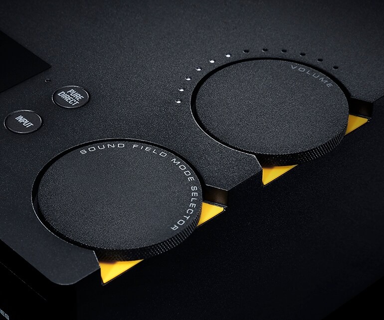 The top panel of the unit features a gorgeous OLED display that provides a variety of information, including the input source, its sampling frequency, volume, and the name of the current Sound Field mode—all in an exceptionally easy-to-read manner. The display automatically turns off after being operated, eliminating any distraction to the sound.